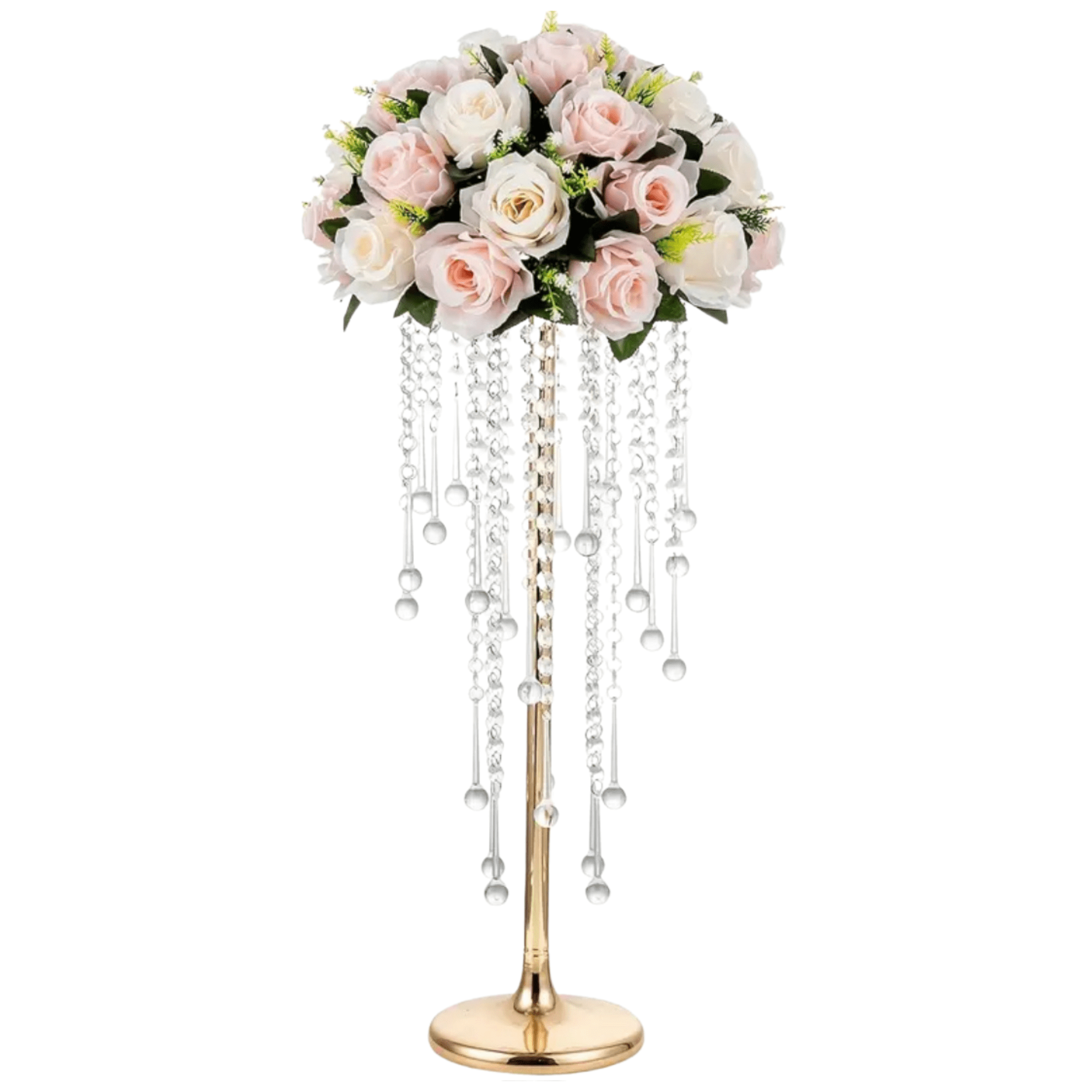 If you’re searching for a gold centerpiece with crystals rental, this design features a sleek pedestal-style base finished in a radiant metallic gold. The bowl-style top is accented with cascading crystal strands that catch and reflect light beautifully, creating a shimmering effect throughout the room.
