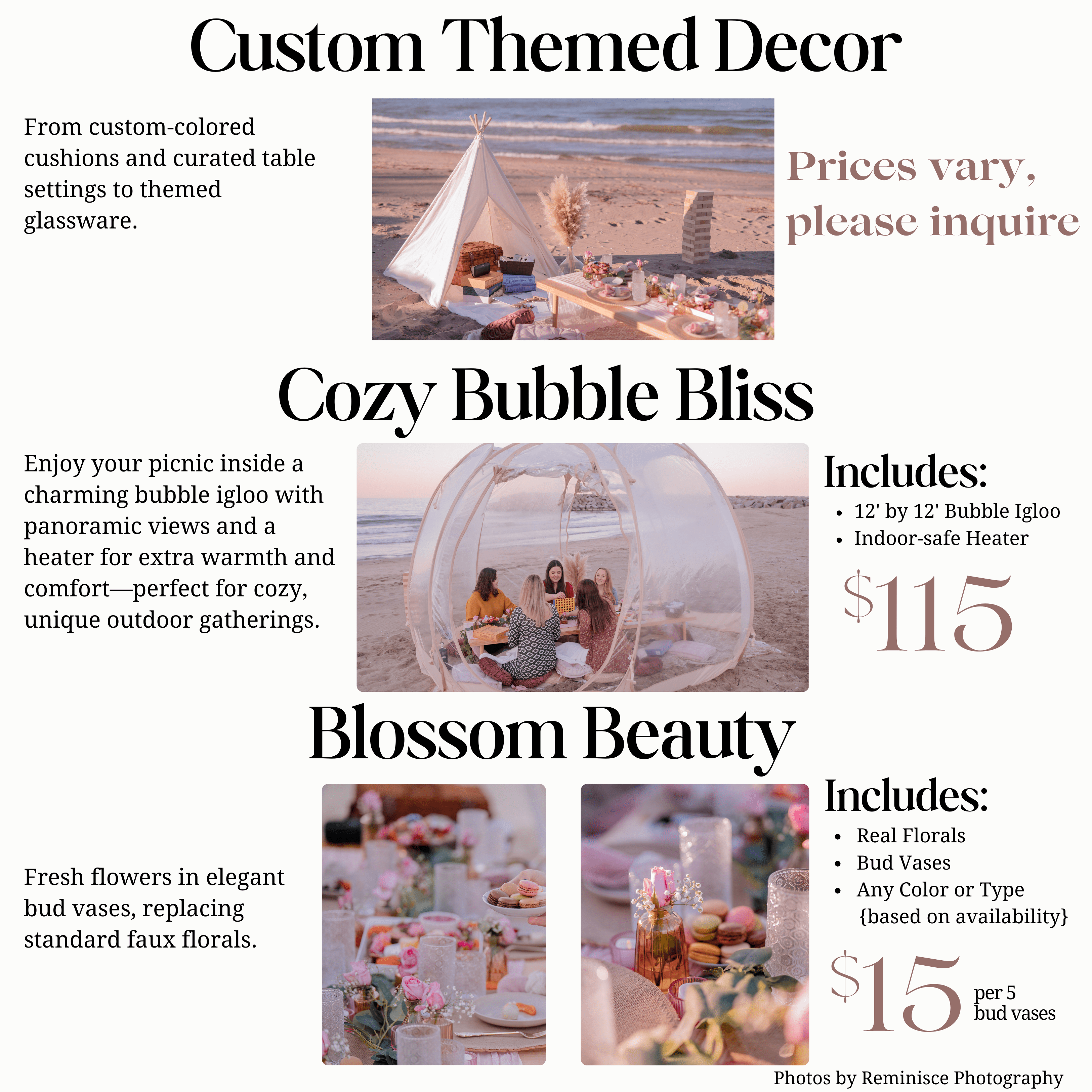 Every luxury picnic rental includes carefully selected décor elements such as: