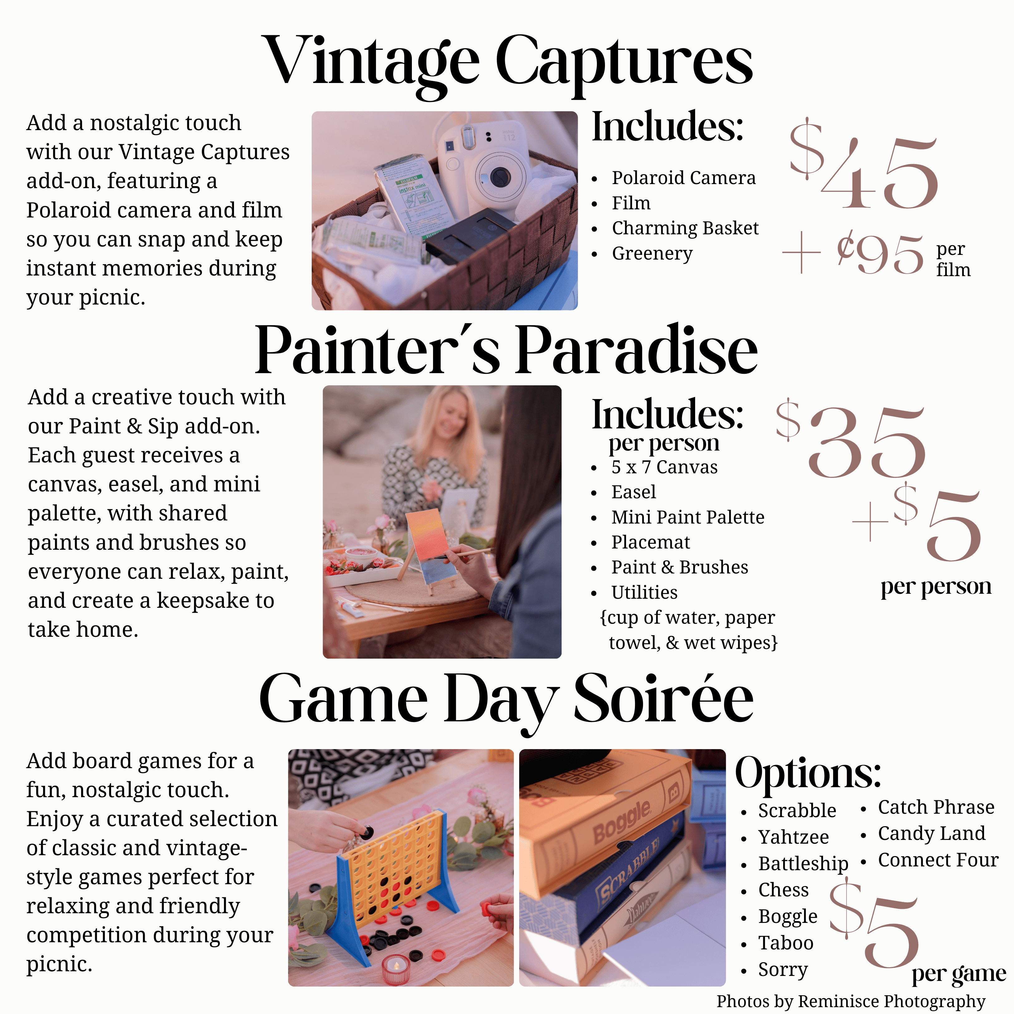 From intimate family celebrations to small group events, our picnic rentals provide a relaxed yet elevated way to gather and celebrate.
