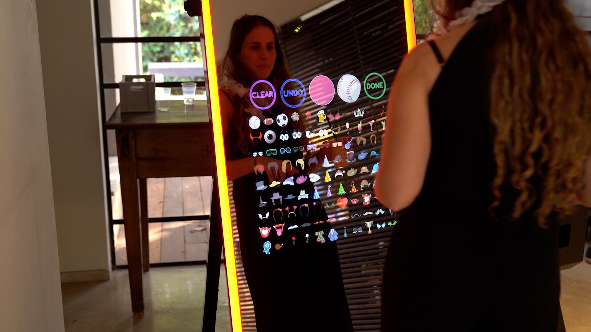 The Magic Mirror Air is a full-length, touchscreen selfie mirror that functions as a modern, interactive photobooth. Guests engage directly with the mirror to capture professional-quality photos, create GIFs and boomerangs, sign digital messages, and add custom effects. The mirror responds with animations, prompts, and visual feedback, creating a truly immersive and entertaining experience.