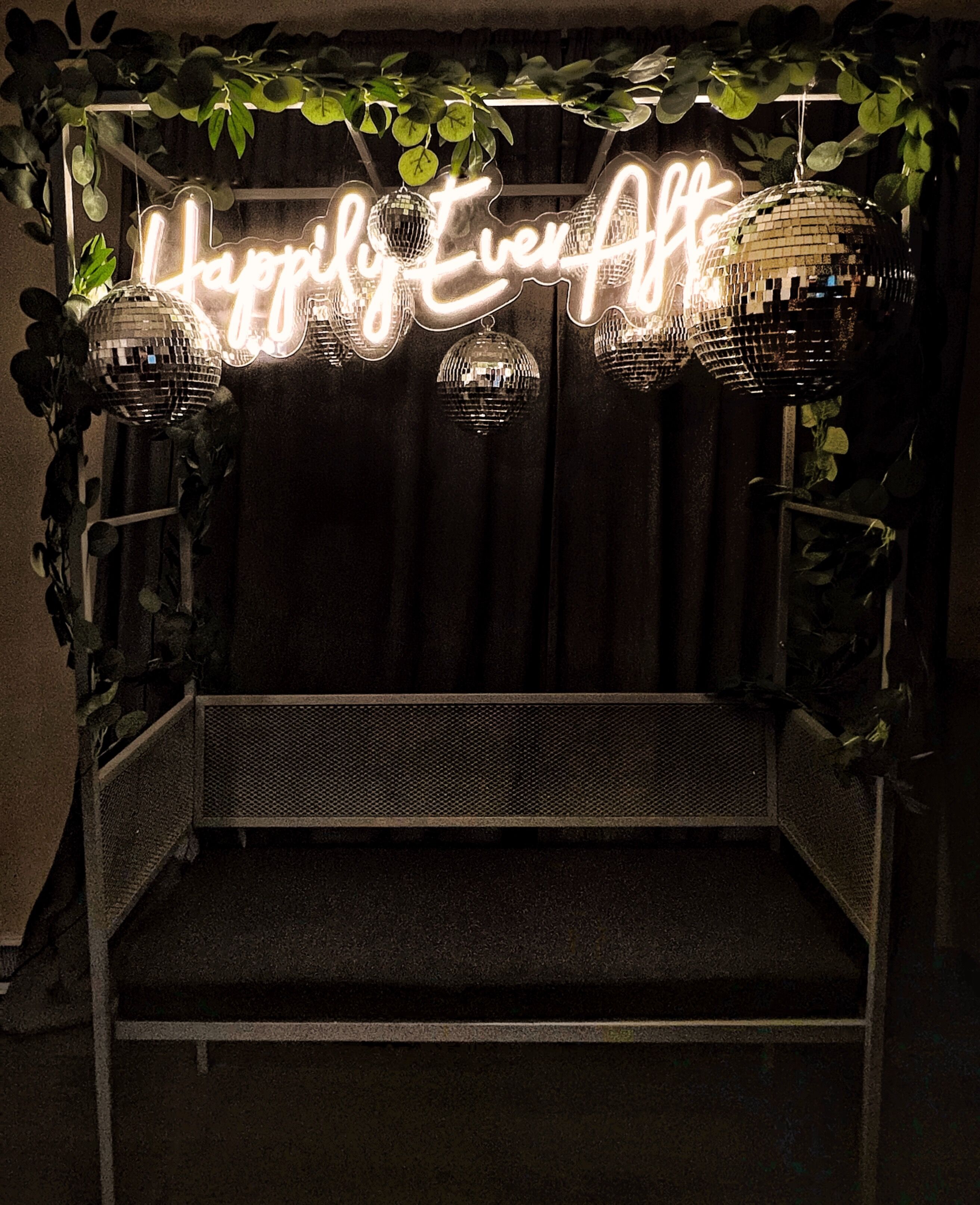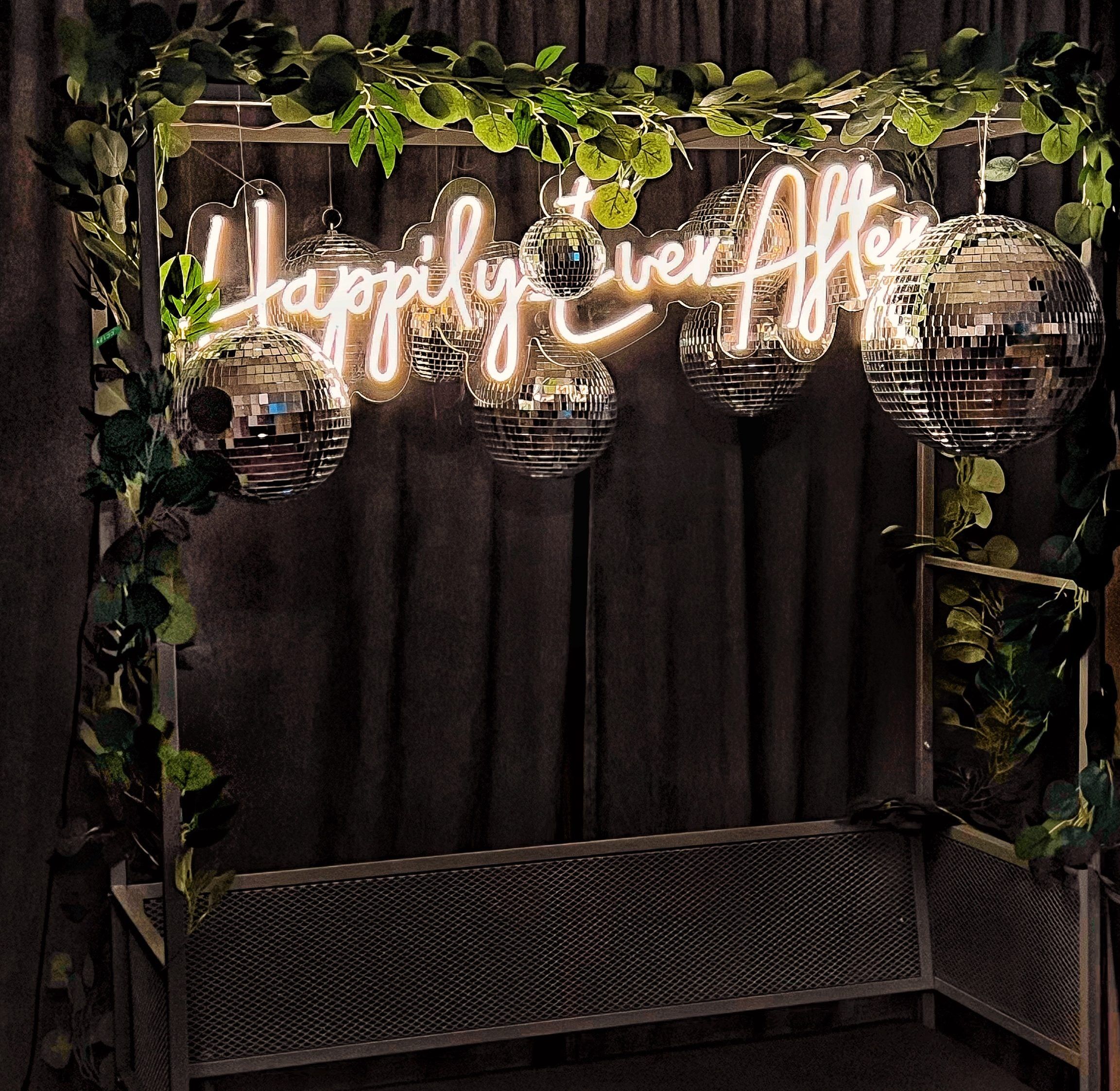 Glowing Neon & Disco Ball Decor: Our setup features sparkling disco balls paired with trendy neon signs to instantly set a vibrant, fun-filled tone for your event. These decorative elements not only attract attention but also elevate the aesthetic of your event space.