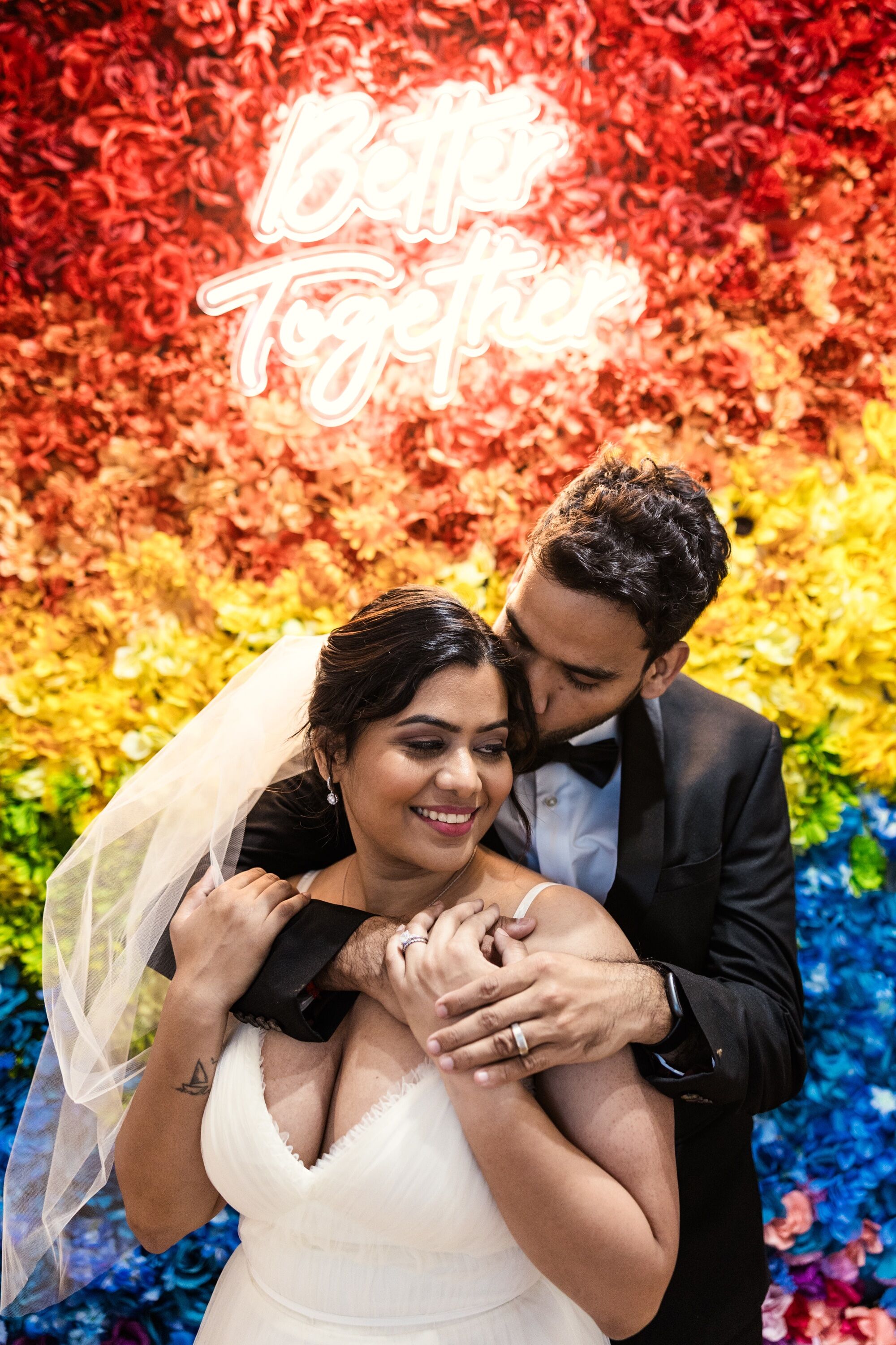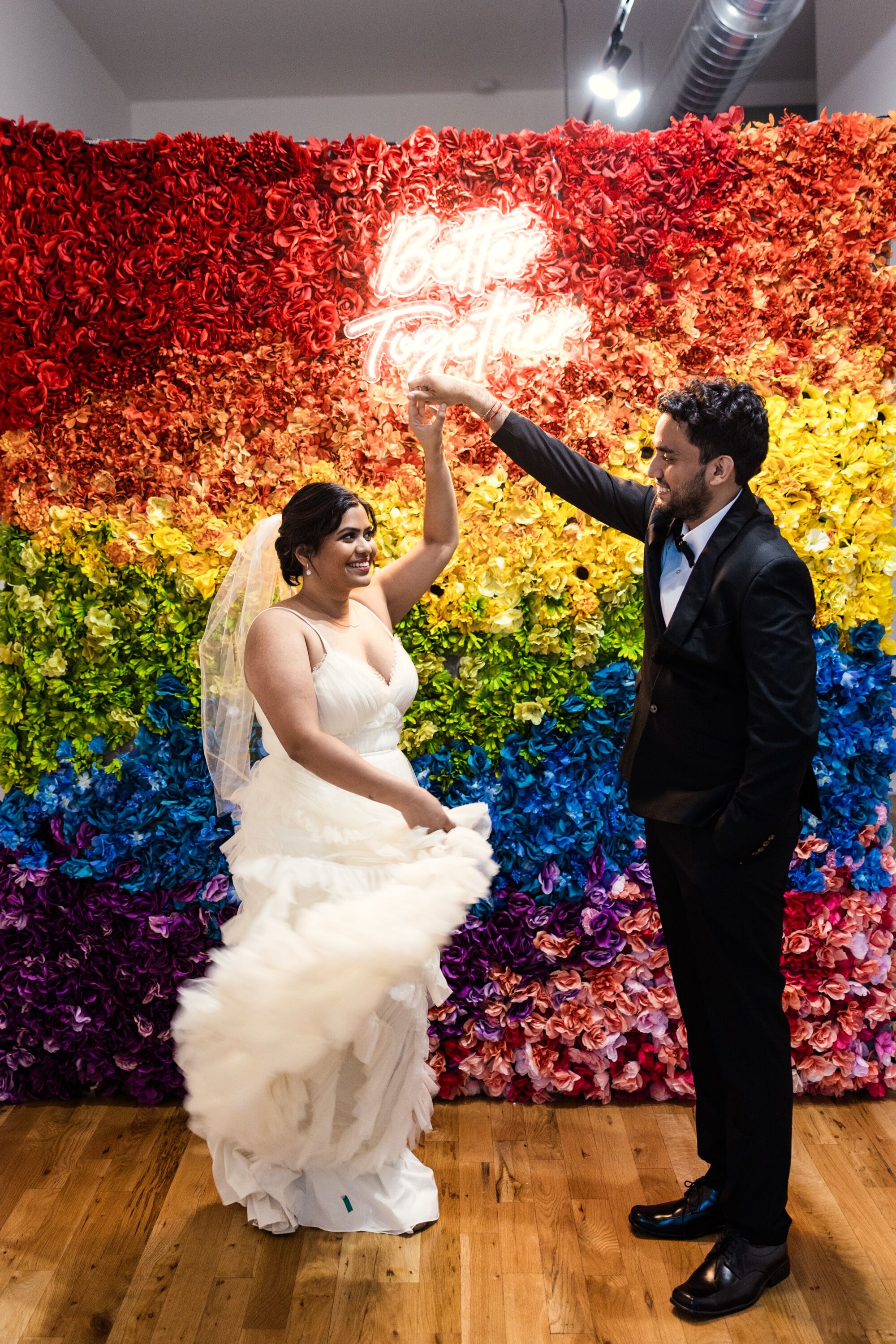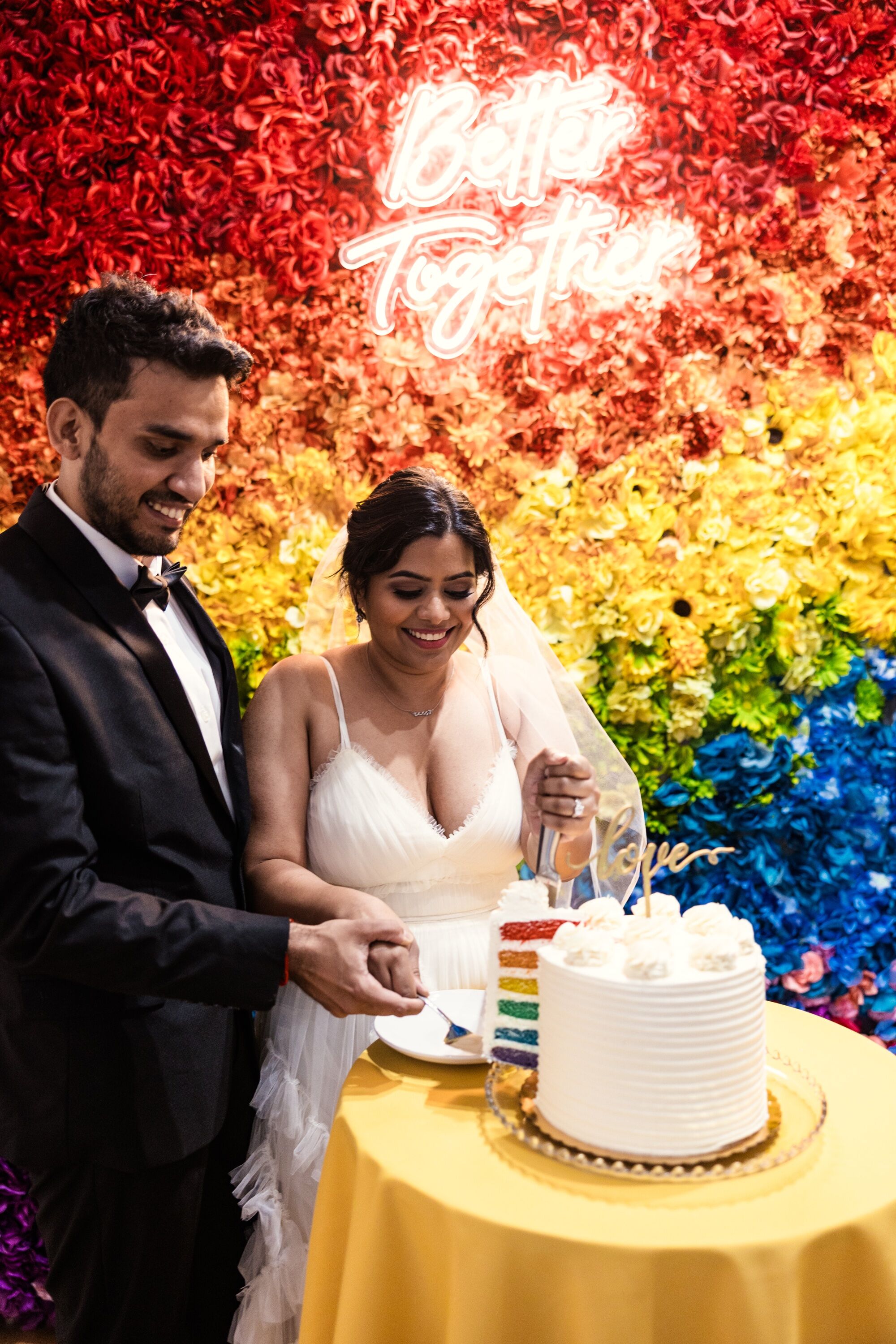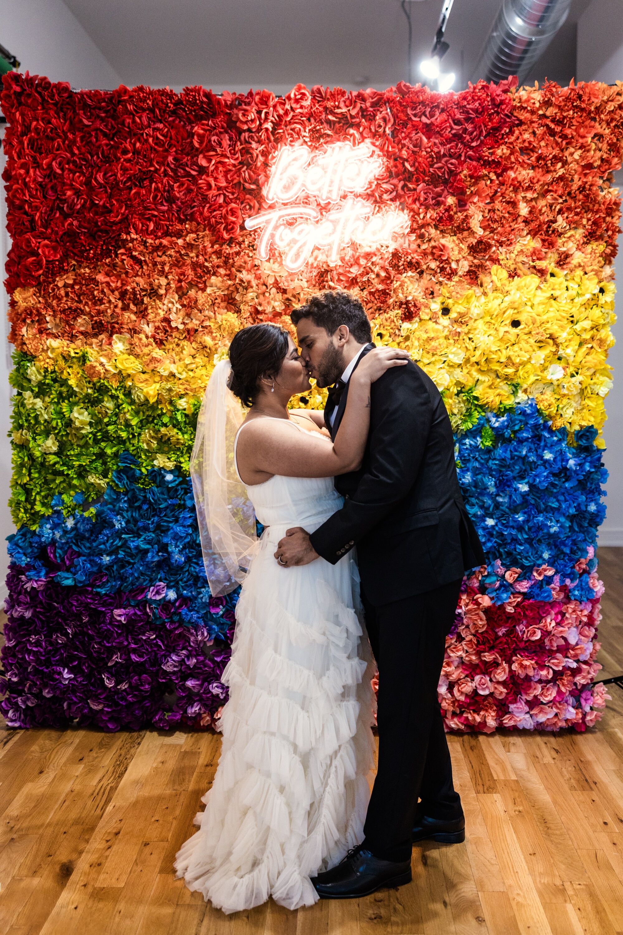 - Sweetheart Table or Ceremony Backdrop: Frame your most important moments with a wall of rainbow blooms. It brings a romantic yet fun vibe to any wedding.
